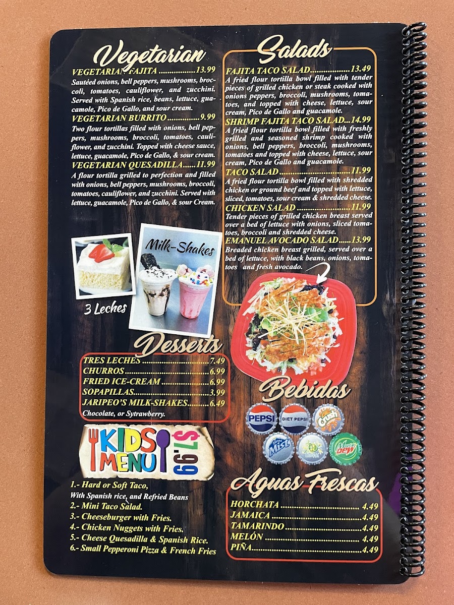 Grilled chicken or Steak cooked with onions, bell peppers, brócoli, mushroom and tomatoes served with Mexican salad, Spanish rice and refried beans
