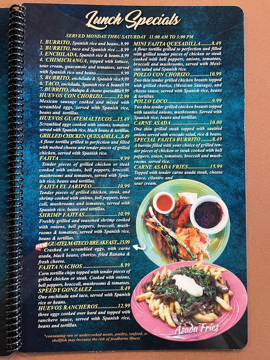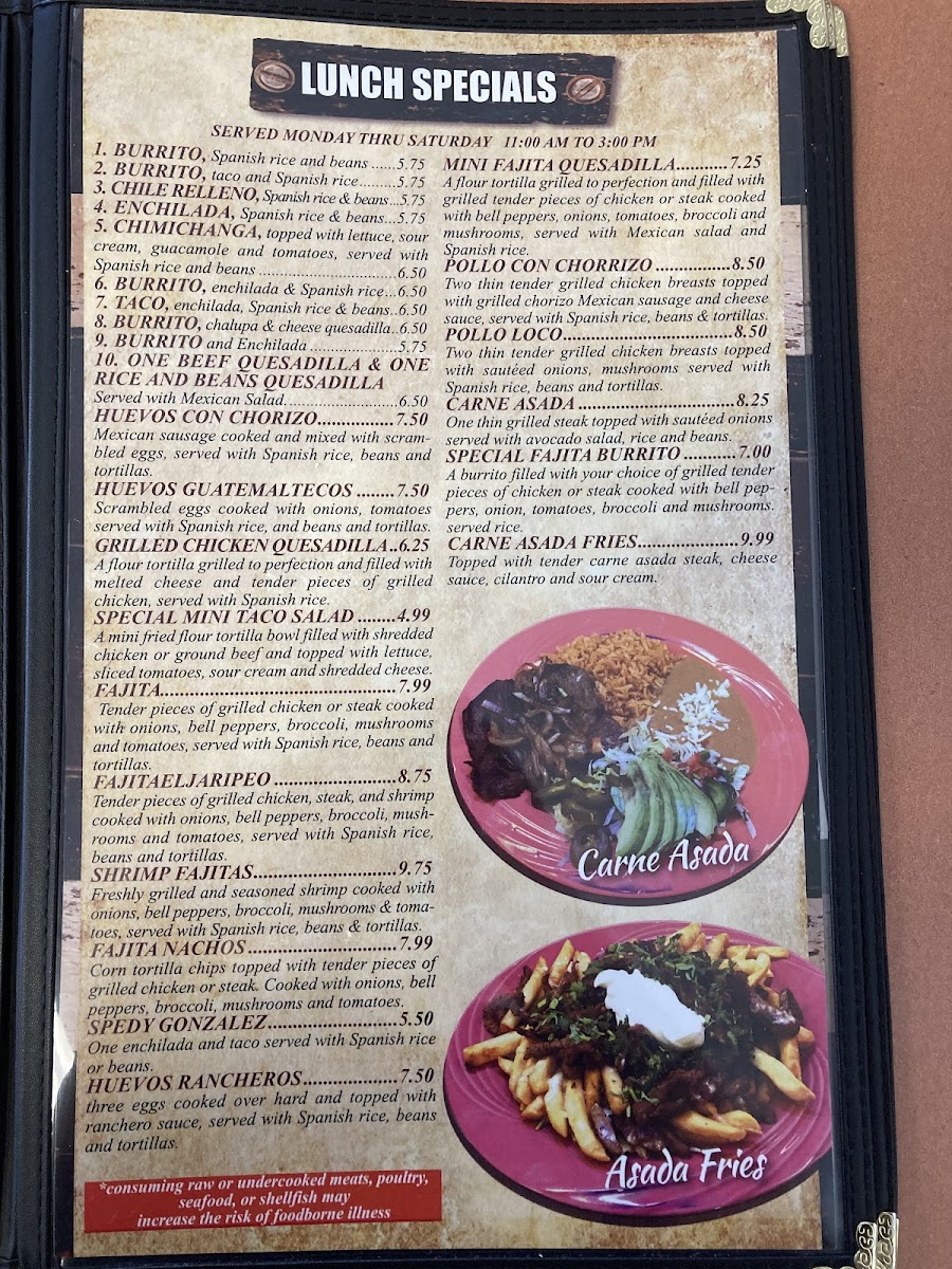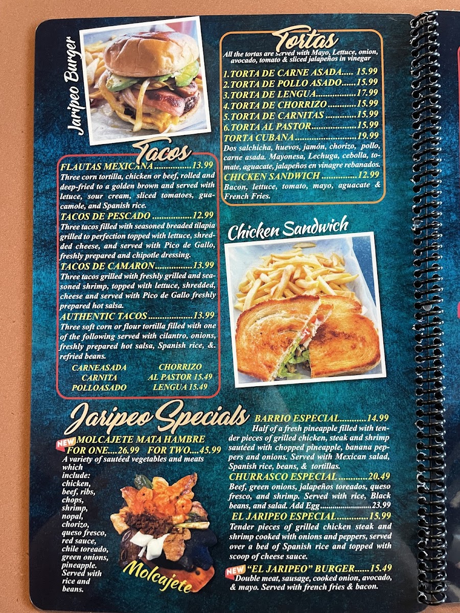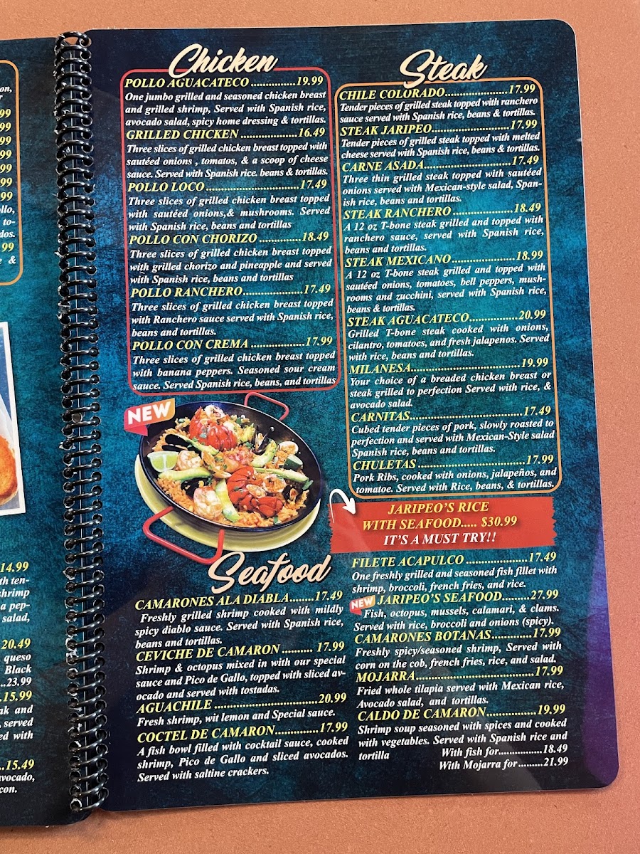 Chicken or steak cooked with bacon, pineapple, onions, mushrooms, tomatoes and covered with shredded cheese served with Mexican salad, Spanish rice and refried beans