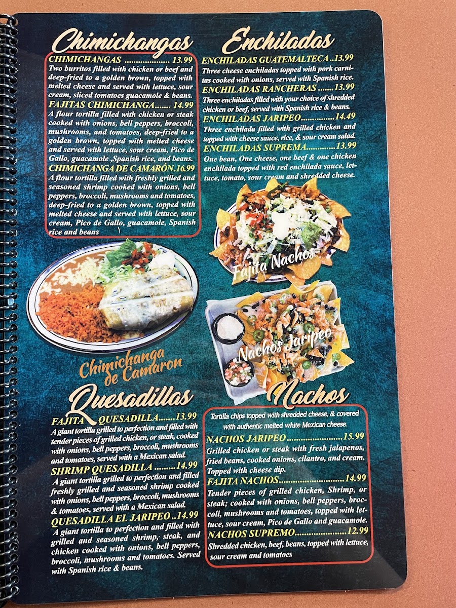 Freshly grilled and seasoned shrimp cooked with onions, bell peppers, brócoli, mushrooms, and tomatoes wrapped in a flour tortilla, topped with cheese sauce and served with Spanish rice and guacamole salad.
