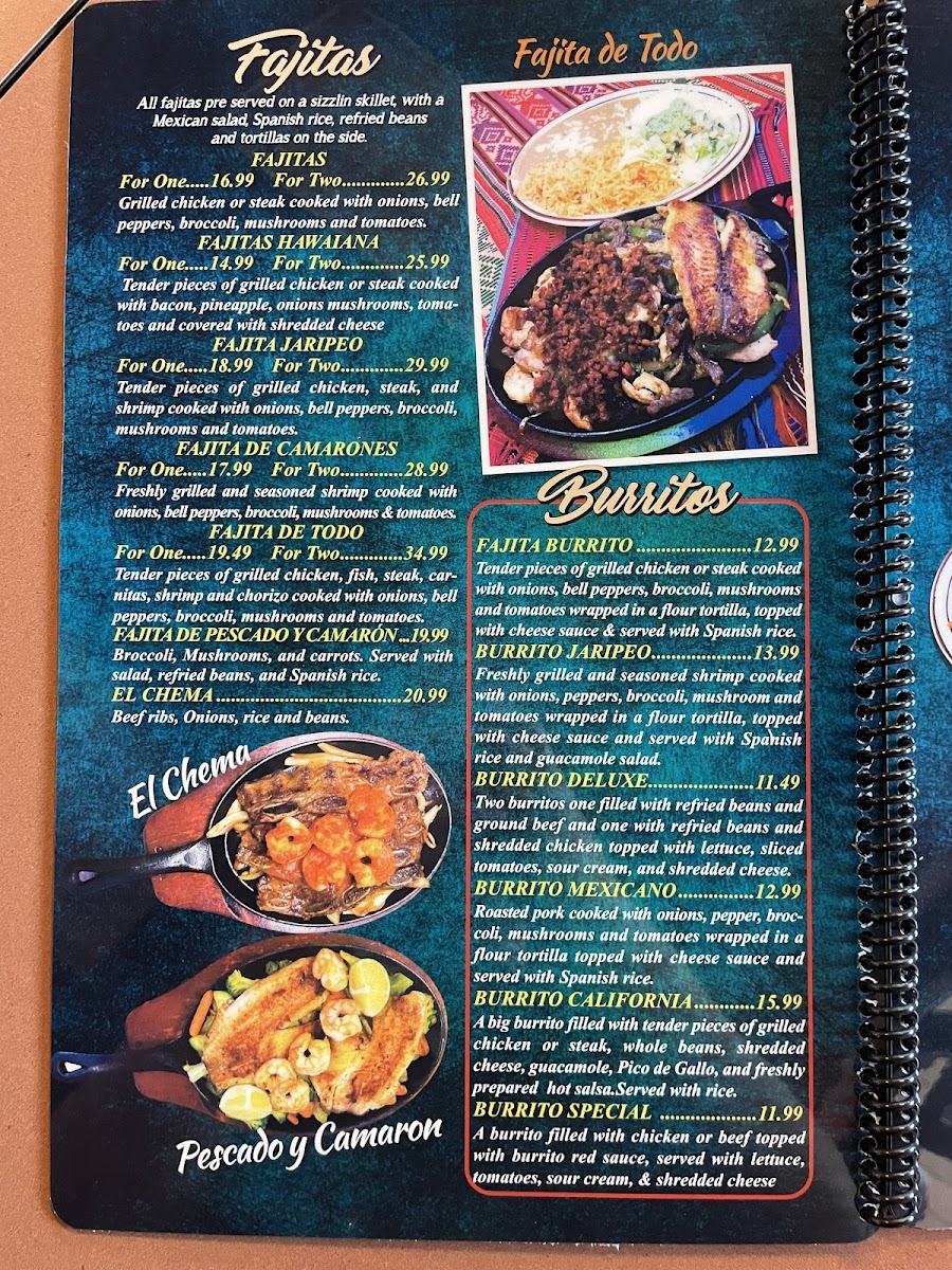 Tender pieces of grilled chicken, fish, steak, carnitas, shrimp and chorizo cooked with onions, bell peppers, brócoli, mushroom and tomatoes served with Mexican salad, Spanish rice and refried beans